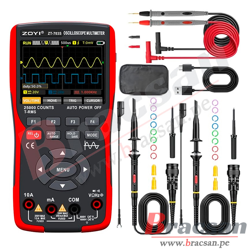 El ZT703S 3 en 1 tiene un diseño de tres modos para osciloscopio digital y multímetro. Incluye cambio de modo con un solo botón, adquisición automática de formas de onda, calibración de base de tiempo, almacenamiento y exportación de datos, selección de idioma, ajuste del tiempo de apagado, retroiluminación ajustable, puerto de transmisión de datos, ajuste de salida de señal y funciones de almacenamiento.